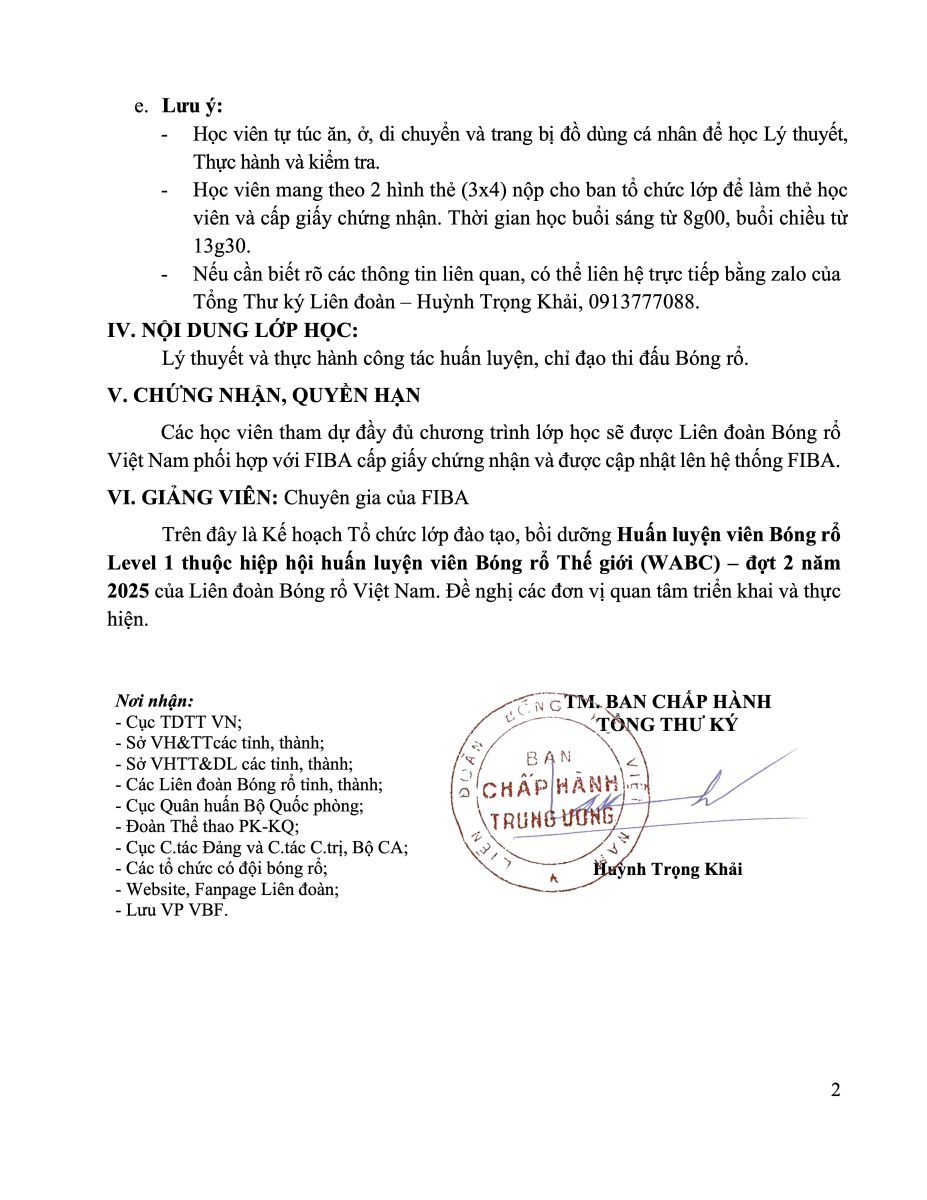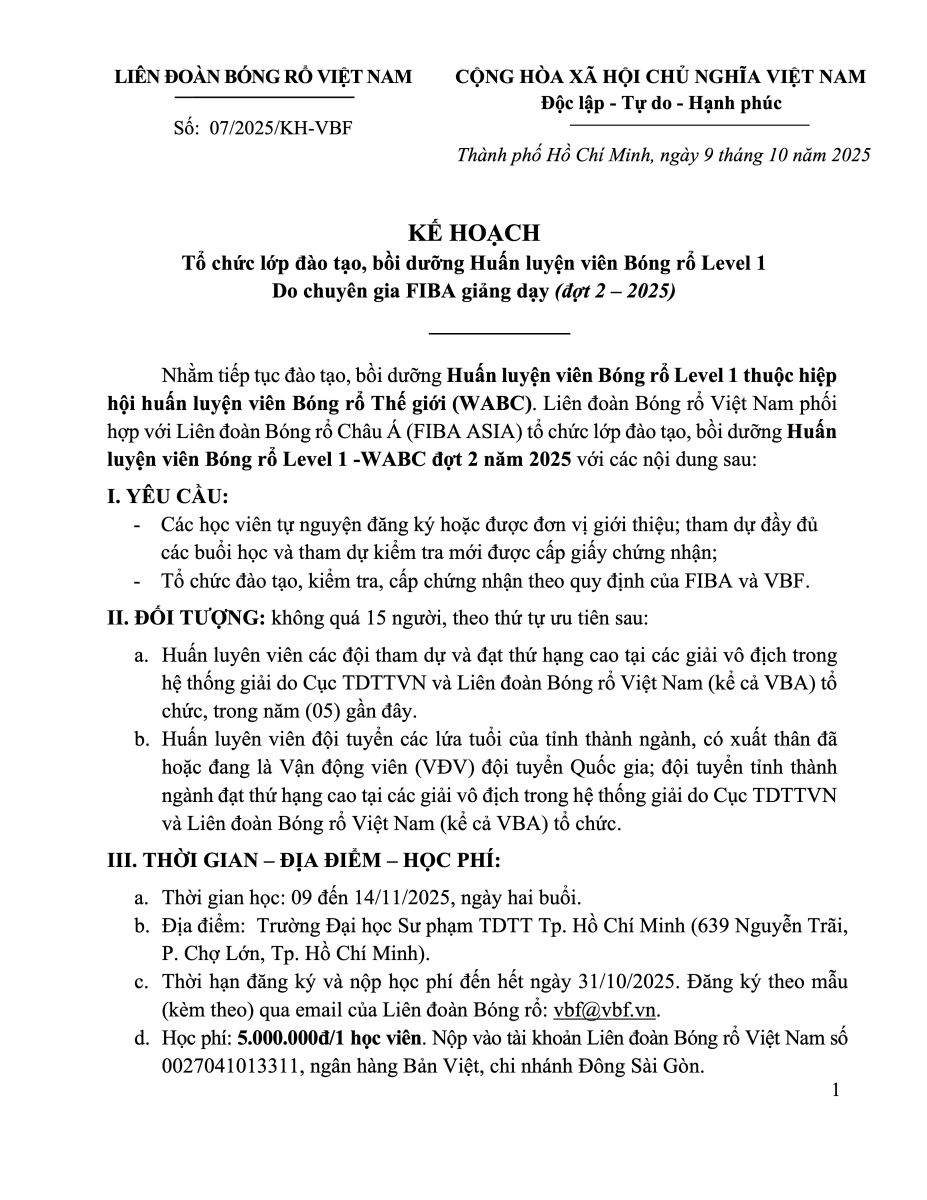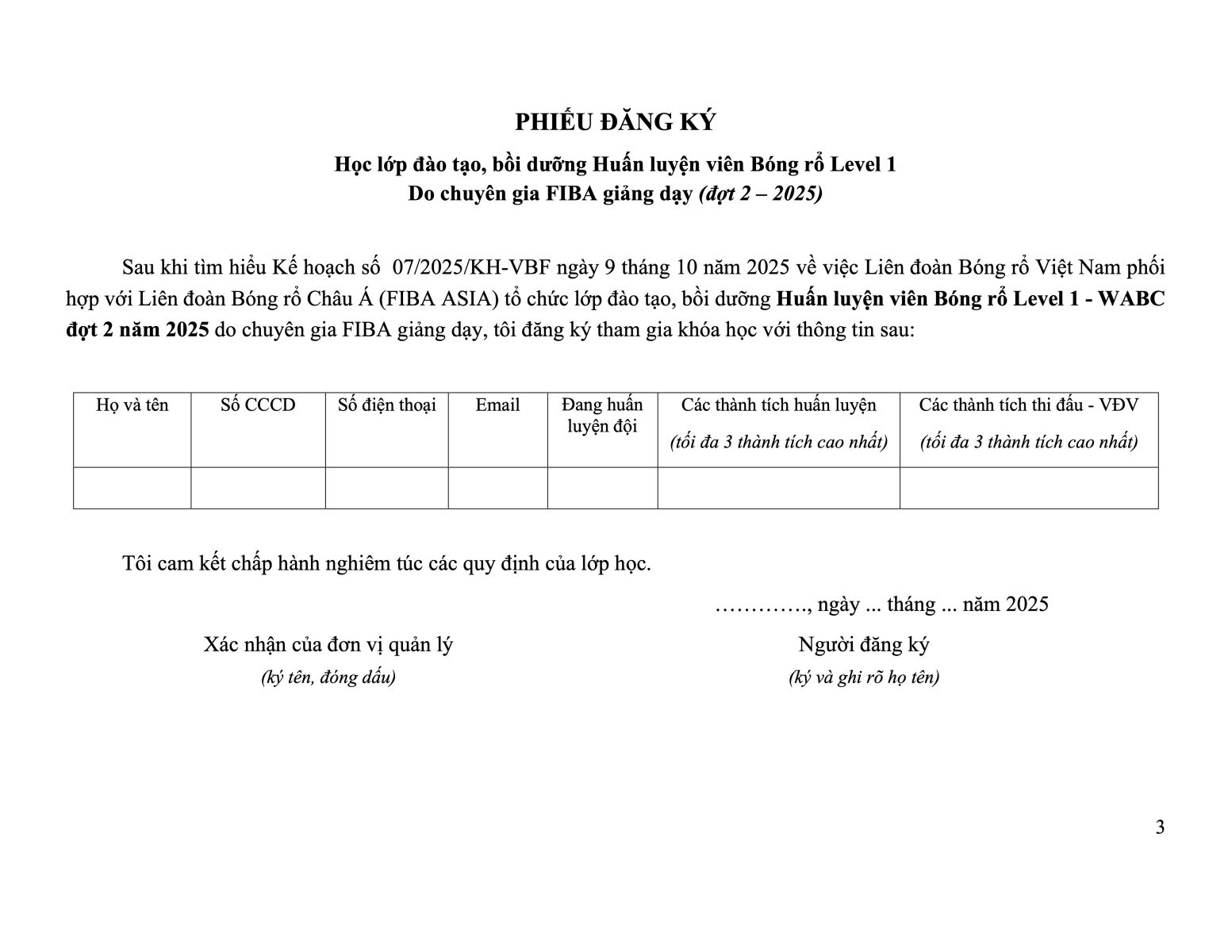Thời hạn đăng ký và nộp học phí đến hết ngày 31/10/2025. Đăng ký theo mẫu (kèm theo) qua email của Liên đoàn Bóng rổ: vbf@vbf.vn.